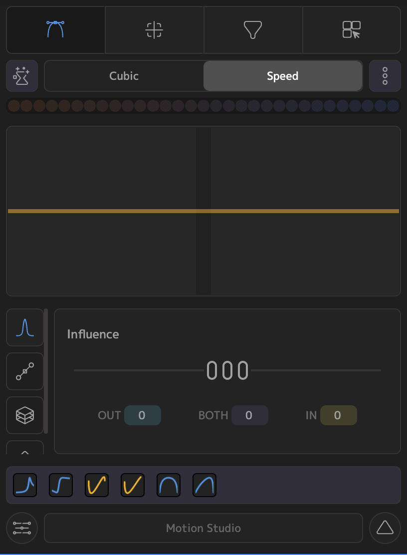 It works similarly to the influence slider, as there is one slider for 'speed in' and one for 'speed out'. We chose to make these sliders full width, since - unlike influence - these values are not capped from 0 to 100. They can be much larger or smaller, so more slider space was necessary. The large pill on the left works the same as influence. Clicking it once will apply the Speed values to selected keys, and clicking and dragging will adjust both Speed sliders simultaneously.