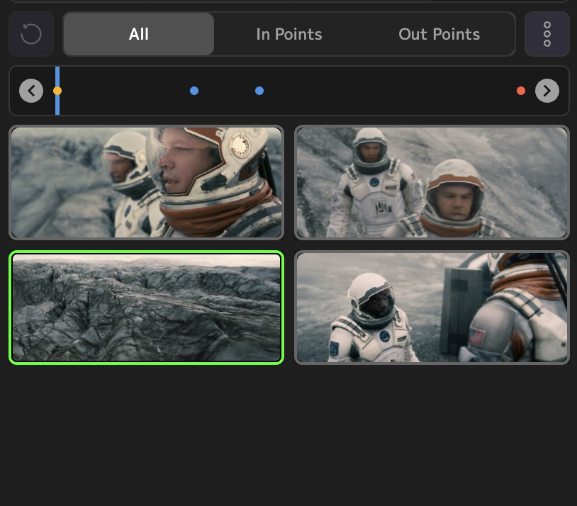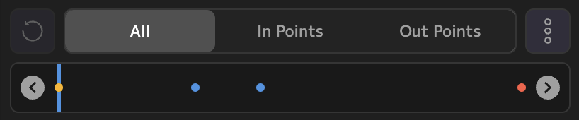 View all of the in-point and out-point edits in the timeline at the top of the screen. Toggle between "All", "In Points" and "Out Points". Click the left and right arrow icons to go to the previous or next edit point, respectively. Alternatively, click directly on the edit point to go to that particular edit. In-Points are colored blue, while Out-Points are colored red.