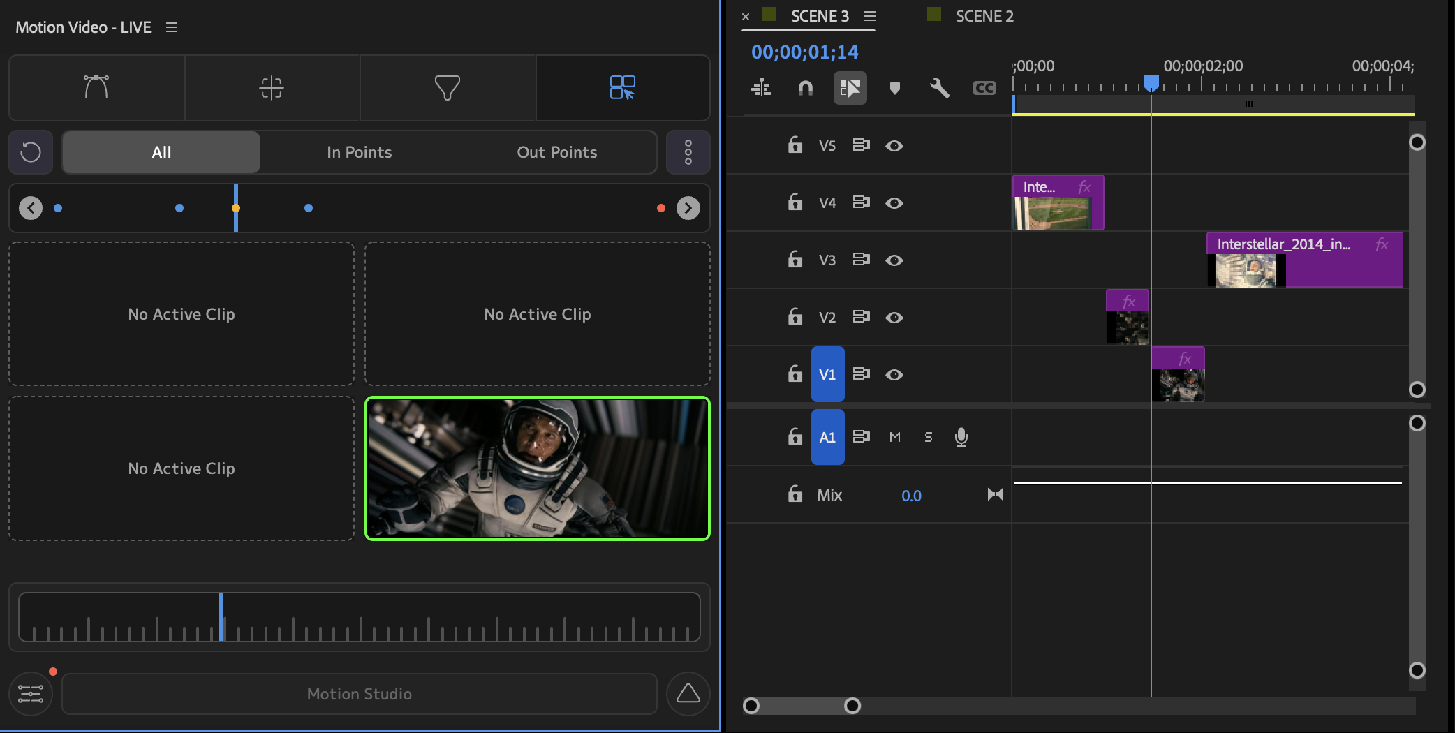 Clips (videos and images) in the Video Tracks at the current CTI will populate the Switchboard page. Active clips receive a Green border, while disabled clips have a default grey border. Hovering each clip will reveal the Track number it is in.